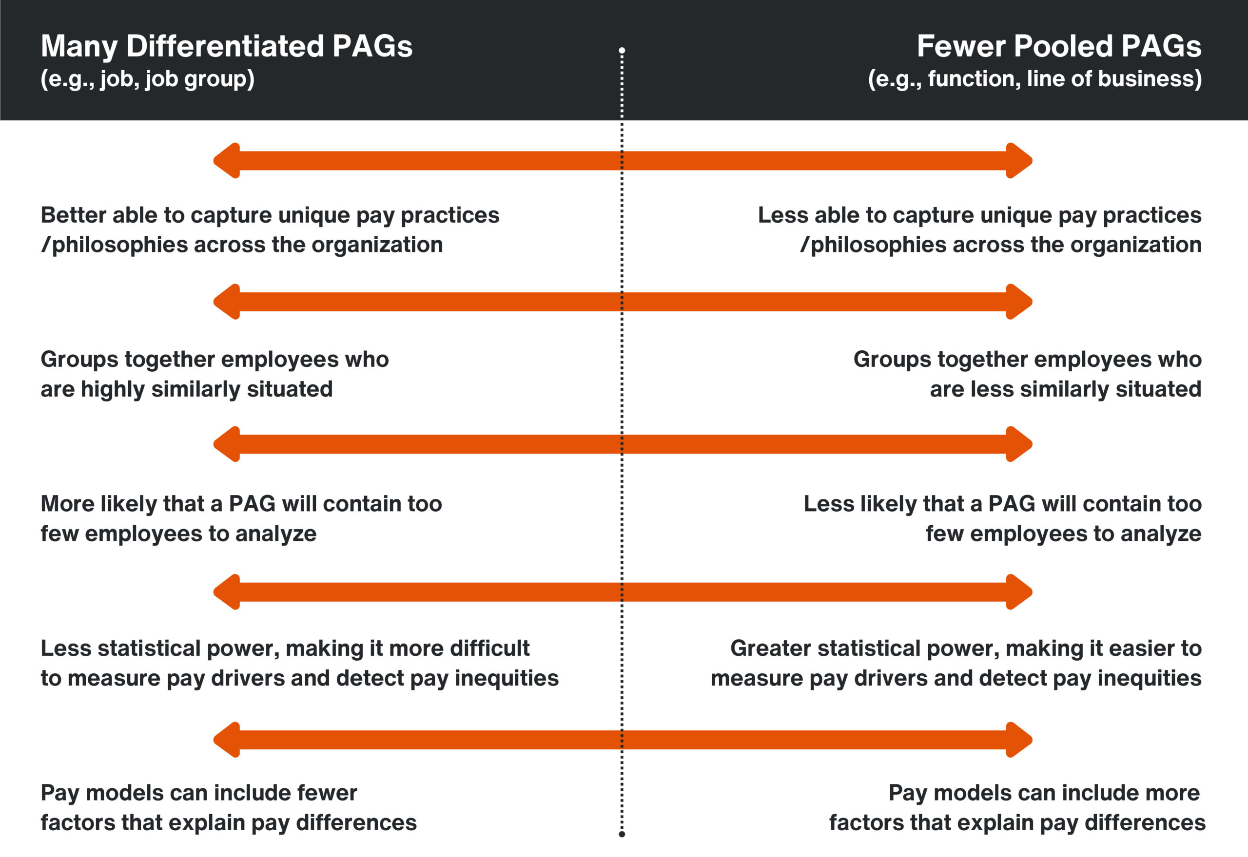 The formation process needs to balance “differentiation,” which allows you to capture unique pay practices associated with different parts of your workforce, and “pooling,” which improves the statistical power of your analyses. The figure below summarizes the trade-offs associated with two different PAG creation approaches: