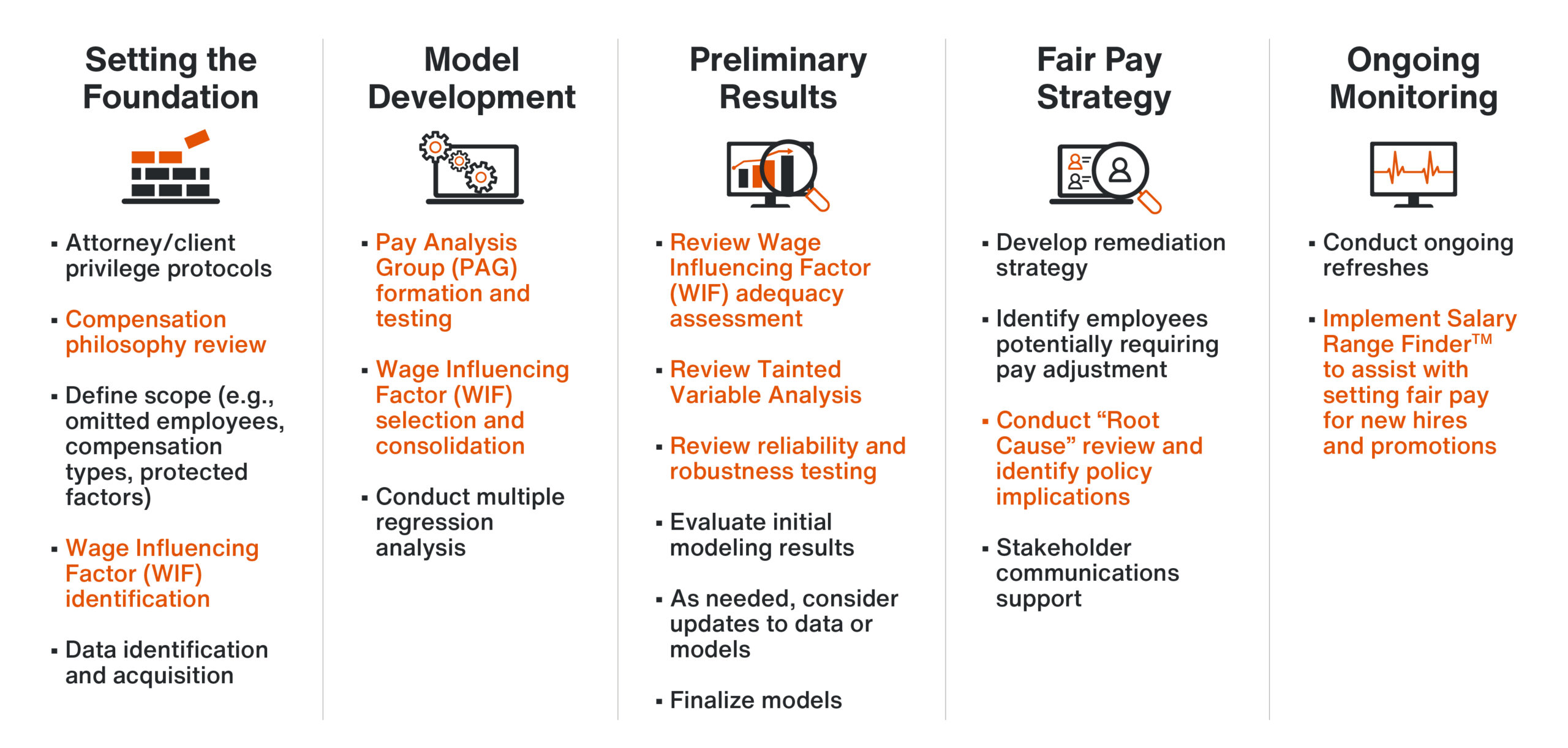 When conducting a pay equity review, we break down the process into five phases: